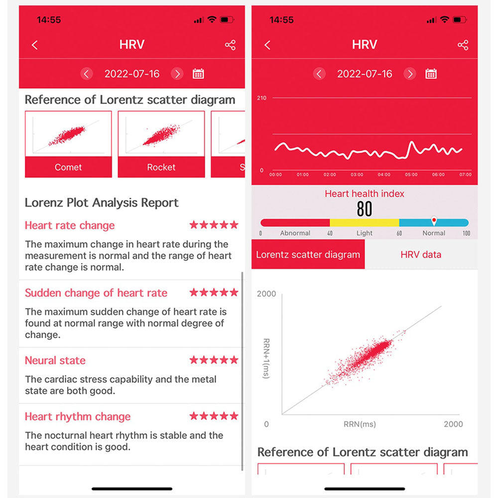 In der App gibt es Berichte zur HRV-Herzgesundheitsindexanalyse und zur Lorenz-Streudiagrammanalyse, mit denen sich die Gesetzmäßigkeiten des Herzschlags intuitiv erkennen und Herzrhythmusstörungen intuitiv beurteilen lassen.